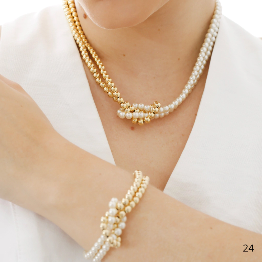 A pulseira de pérolas com esferas entrelaçadas é uma peça elegante e moderna que combina a beleza clássica das pérolas com um design contemporâneo. É uma pulseira versátil, podendo ser usado em diversas ocasiões, desde eventos formais até os casuais .